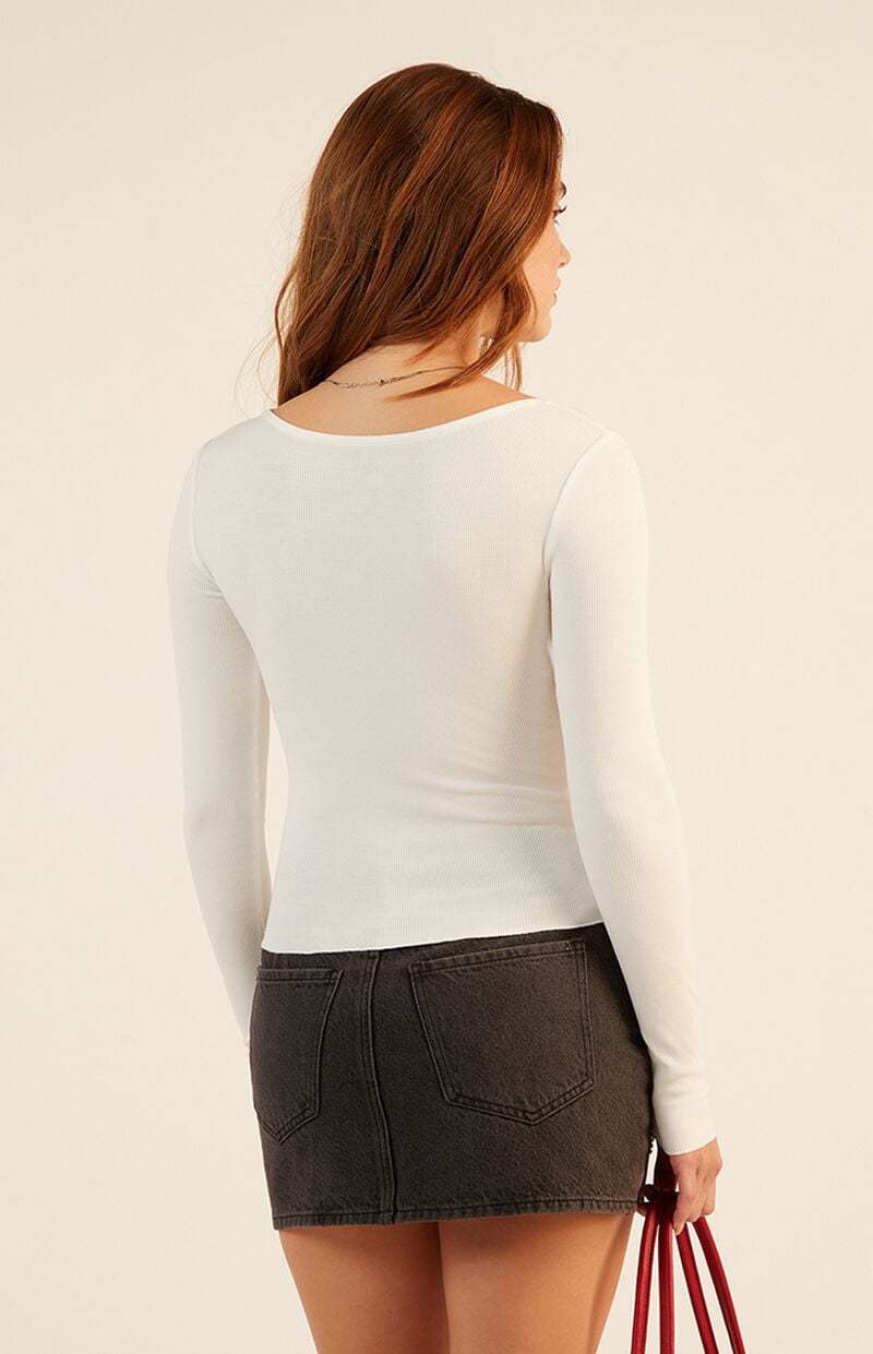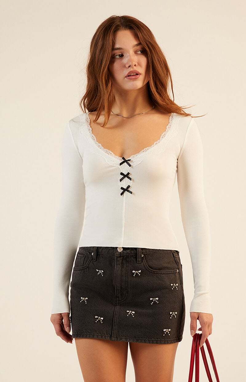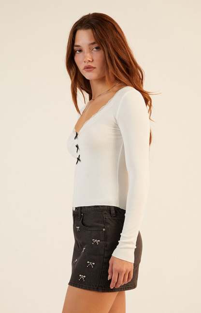 The V-Neck Lace Bow Front Long Sleeve Top from Est. PAC 1980 brings a touch of elegance to everyday wear with its soft ribbed fabric and delicate lace trimming. Featuring a flattering V-neckline, three charming bow details down the front, and a fitted silhouette, this long sleeve top adds a romantic vibe to any outfit.