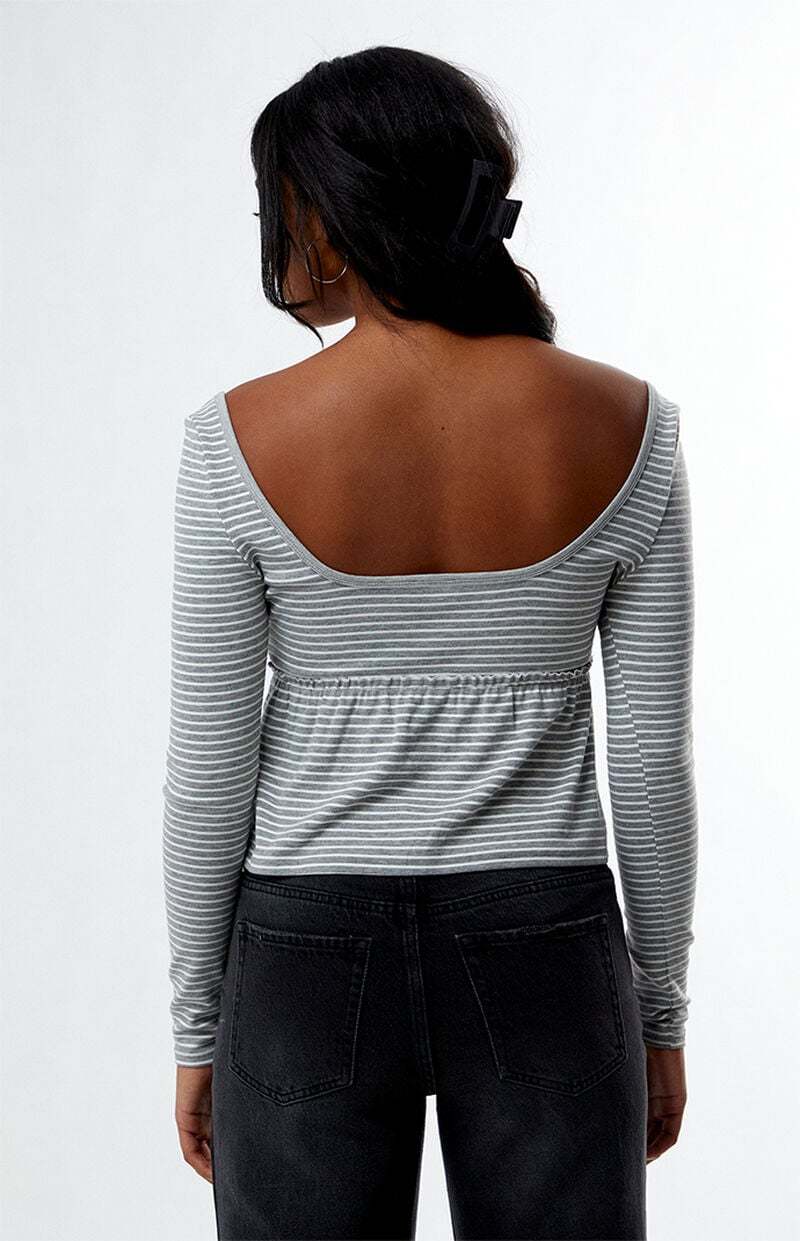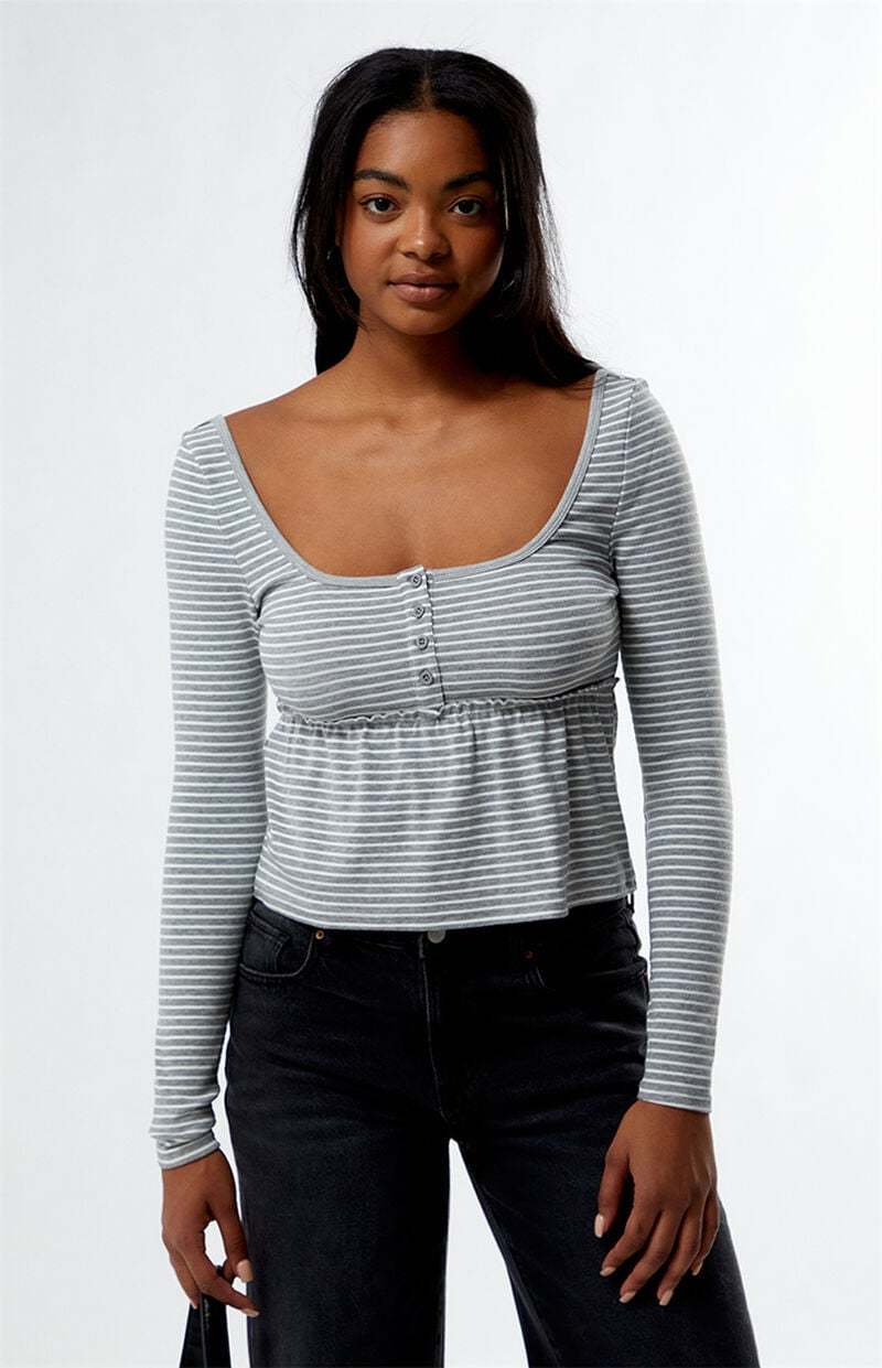 The Striped Long Sleeve Babydoll Top from Est. PAC 1980 combines classic style with a playful twist. Featuring a scoop neckline, button front placket, and a babydoll silhouette, this striped print top has a cropped length that adds a modern touch to any casual outfit.